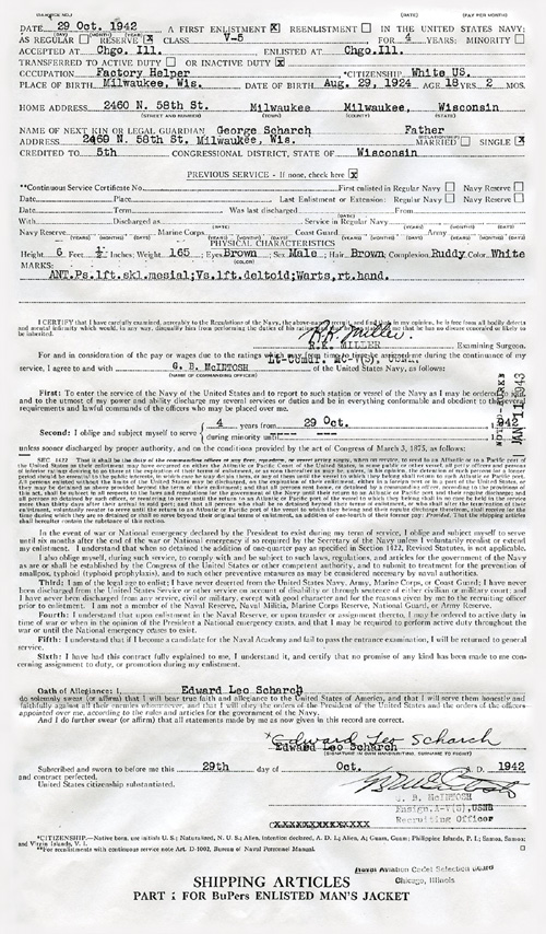 On October 29, 1942, Ed Scharch was just 18 years, 2 months old when he enlisted for a duration of four years with the U.S. Navy. He signed up to be a flyer when the U.S. Naval Reserve waved its college requirement and opened the door to all high school graduates with the right stuff. In Chicago he was given a physical and aptitude exams for cadets. The test was described by one naval cadet as having, "a lot of questions... which was easy if you could remember high school physics." Having passed all tests, Ed was accepted by the Naval Aviation Cadet Selection Board for the AvCad V-5 program. Records indicate "Aviation" as the branch of service for which he was best suited and "Flight Training". Then, he was placed on inactive duty and directed to return home (to Milwaukee) to await further orders. On Nov. 29, 1942, Ed was recalled to active duty for Civilian Pilot Training (CAA-WTS) and reported to NACSB Chicago for physical examination, indoctrination and further assignment. In December 1942, he reported to Carroll College in Waukesha, Wisconsin where he was stationed and was stationed on detached duty. The government also submitted a $10,000 National Service Life Insurance policy on behalf for his family. |